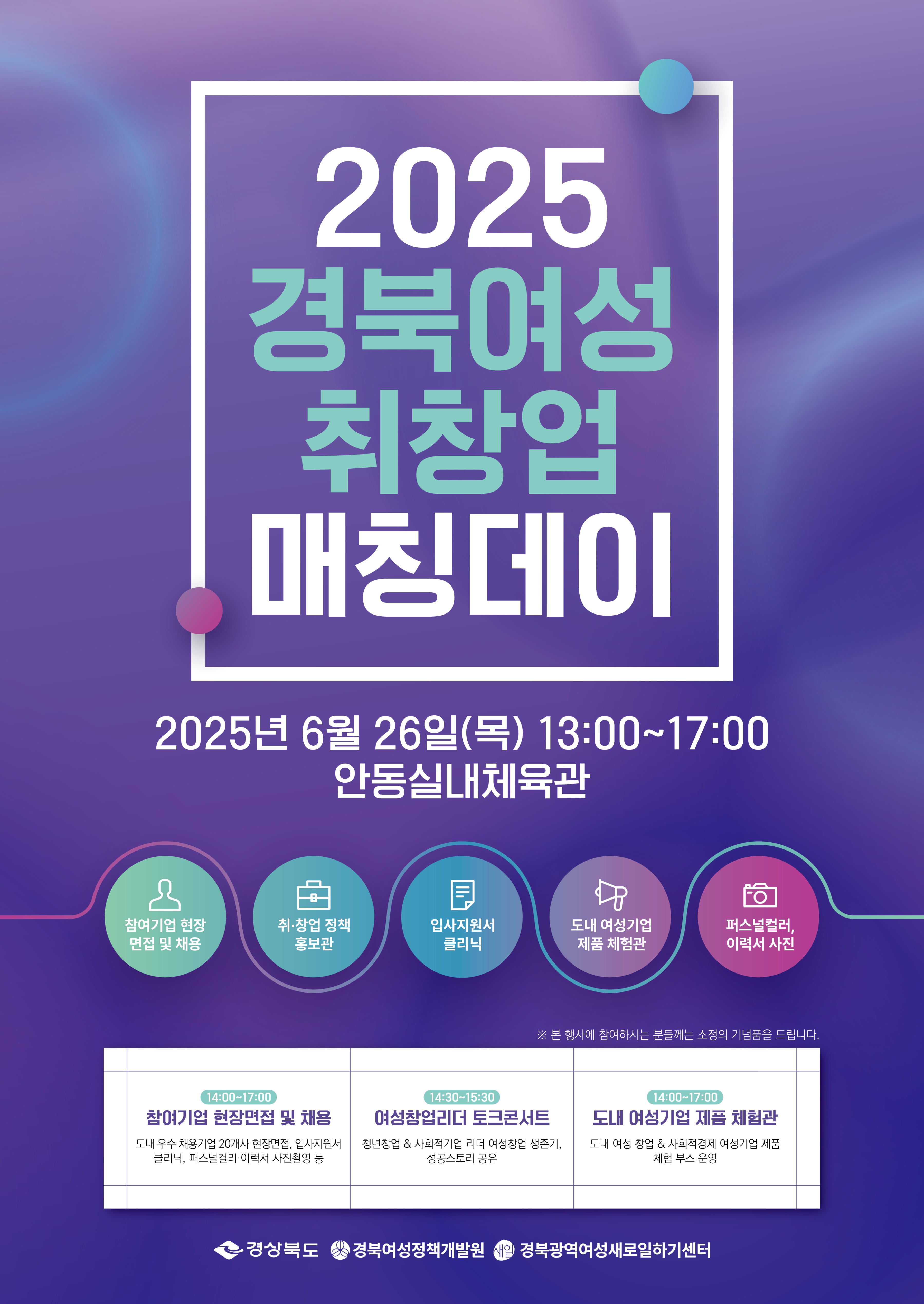 2025 경북여성 취창업 매칭데이 (2025. 6. 26.) 작성자 취창업교육지원센터 작성일 2025-06-24 14:27 조회 156 인쇄 « 2025년 하계방학 제약바이오 거점형 실무역량 양성과정 프로그램 2025년도 하반기 및 2026년도 상반기 보건의료인국가시험 응시원서 접수 안내 공지 » 목록보기 Powered by KBoard