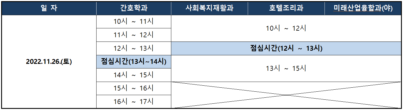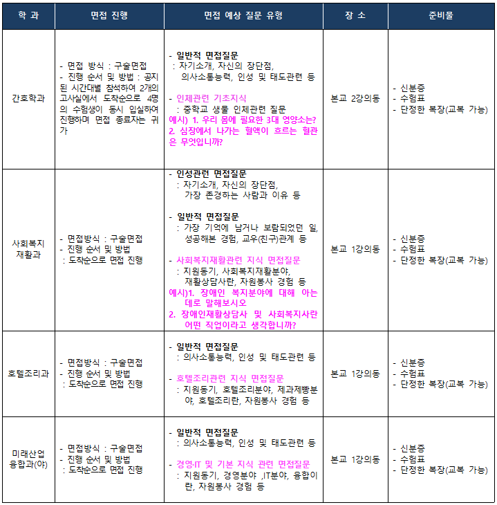 1. 면접학과 : 간호학과, 사회복지재활과, 호텔조리과, 미래산업융합과(야)