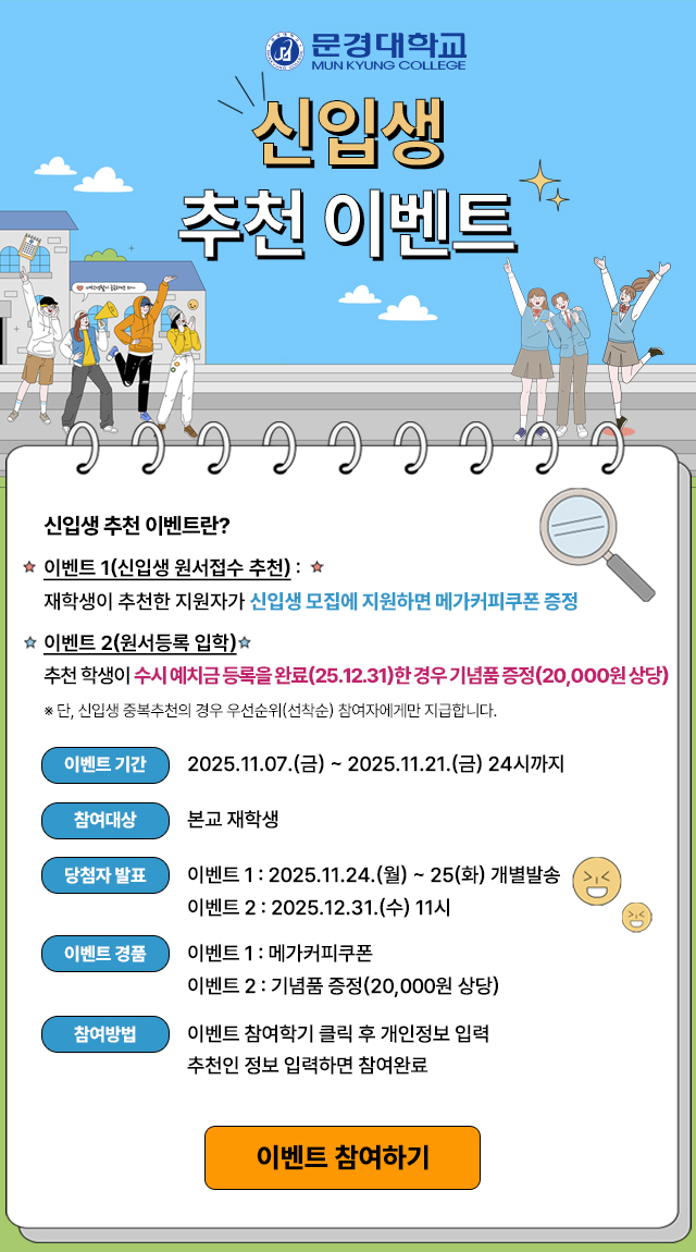 문경대학교는 개인정보수집 및 이용목적이 달성된 후에는 예외 없이 해당정보를 지체없이 파기합니다.